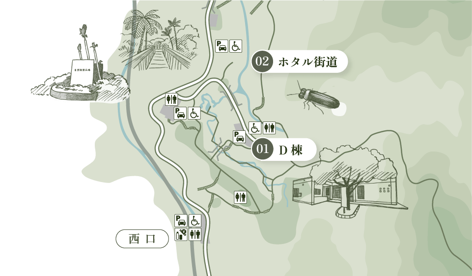 西口からD管理棟へ向かいつきあたりの駐車場をご利用ください。