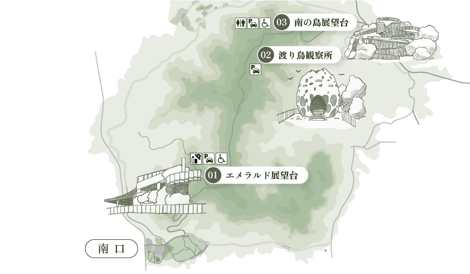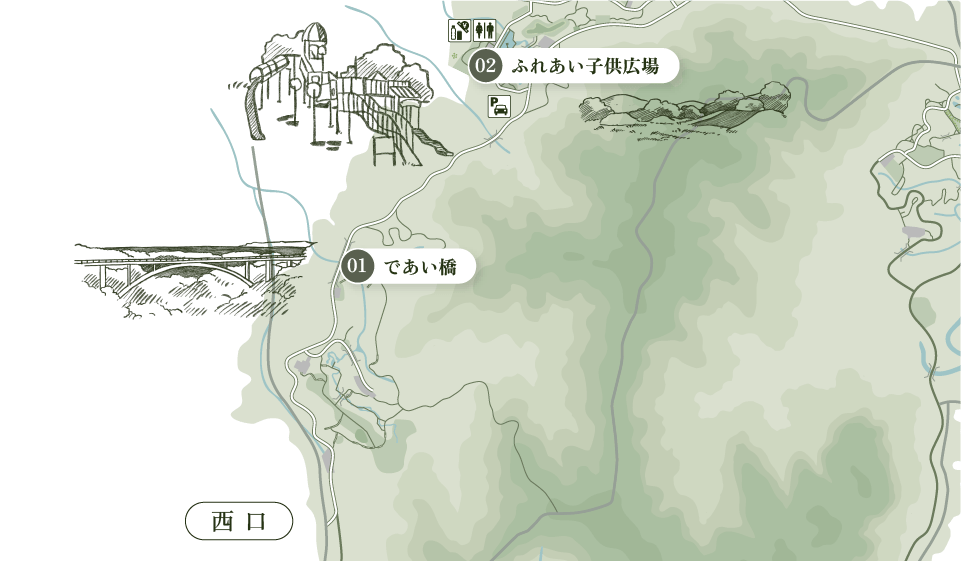西口から道なりに進み「であい橋」を越え、そのまま進み「なかよし橋」を越えた園路を左に曲がると到着します。