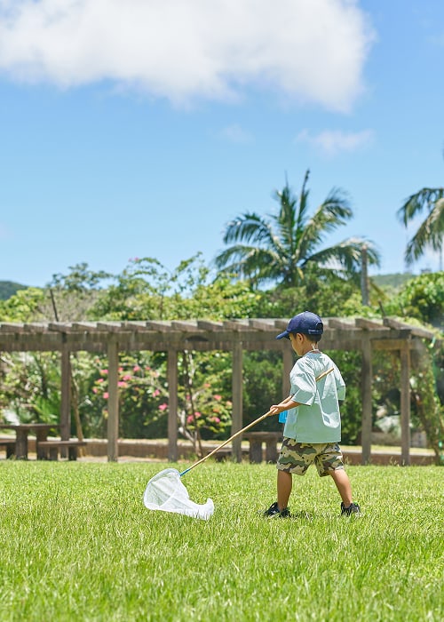 大自然を安全にのびのびと楽しみ、生きものを楽しく知れるコース。遊具がたくさんの広場を楽しんだあとは、ビジターセンターでほっと一息。昆虫館で見つけた生きものを答え合わせしよう。
