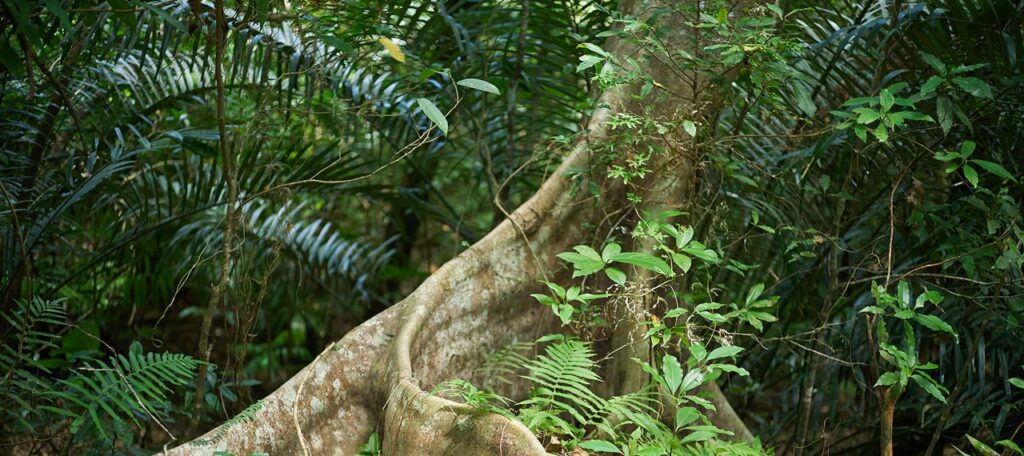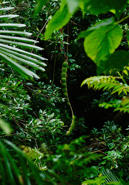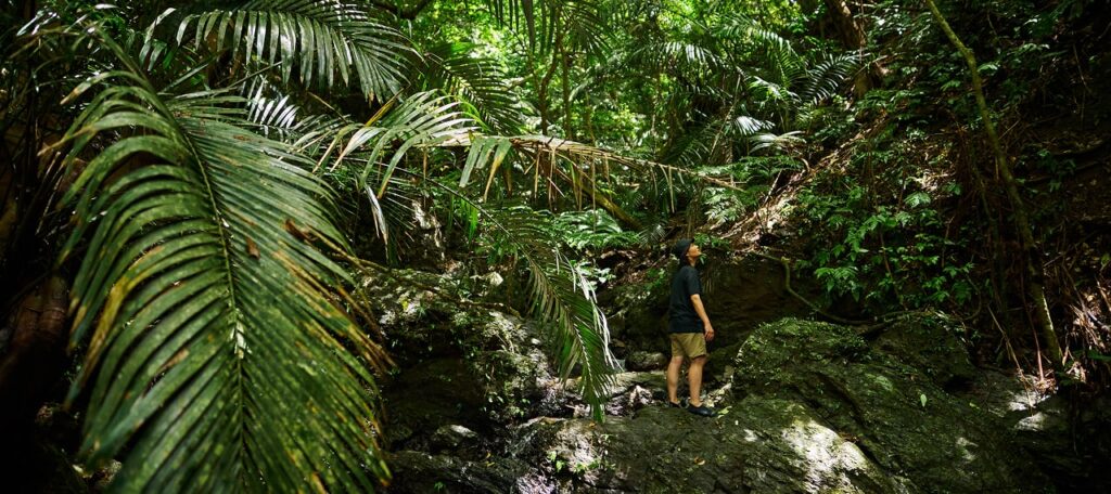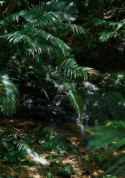 木の階段を降りてさらに奥へ進むと、岩肌に沿って水が湧き出す沢が見られるゾーンに。水音が響くこの一角は、まさしくジャングルの奥地。五感で自然を味わえる場所です。